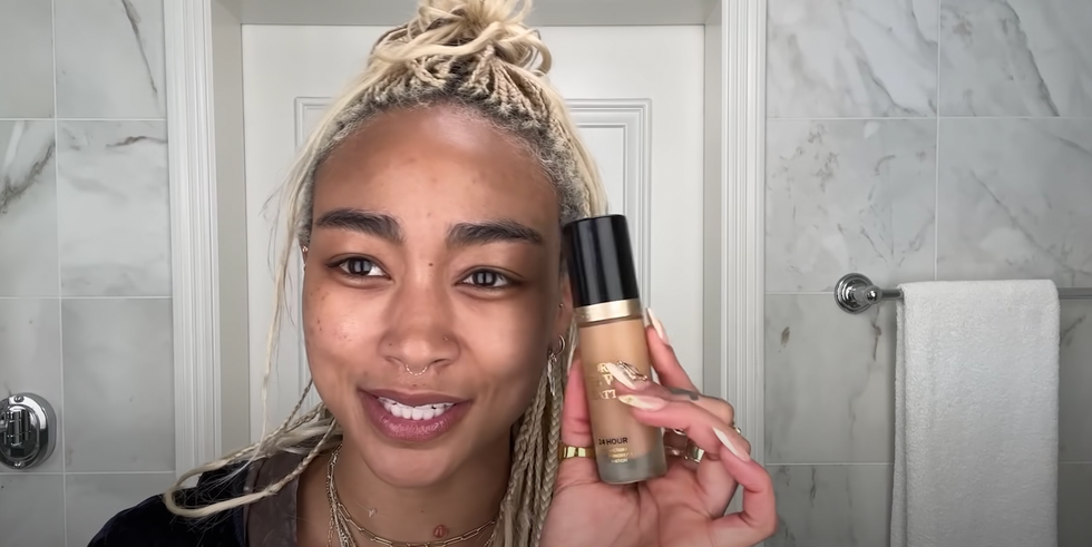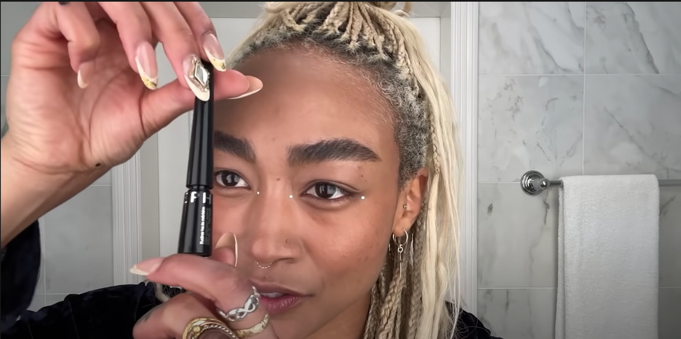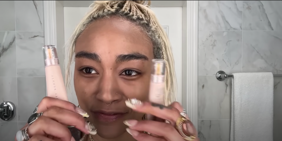 After applying foundation, she used Fenty Beauty Bright Fix Eye Brightener and Lush Charisma Skin Tint for contouring. She then applied Glossier Cloud Paint on her cheeks to “accentuate my apples.”