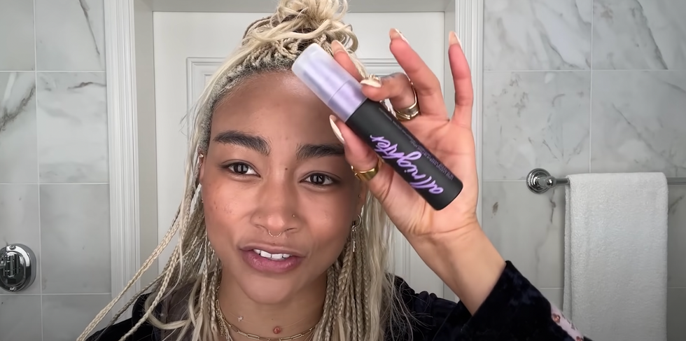 After using One/Size Ultimate Blurring Setting Powder to reduce shine, she topped it off with Urban Decay All Nighter Long-Lasting Makeup Setting Spray. “When I was filming season three of You and we had to wear masks on set constantly, I found that this (setting spray) helped a bunch with keeping things in place so we didn’t have to do as much touch-ups.”