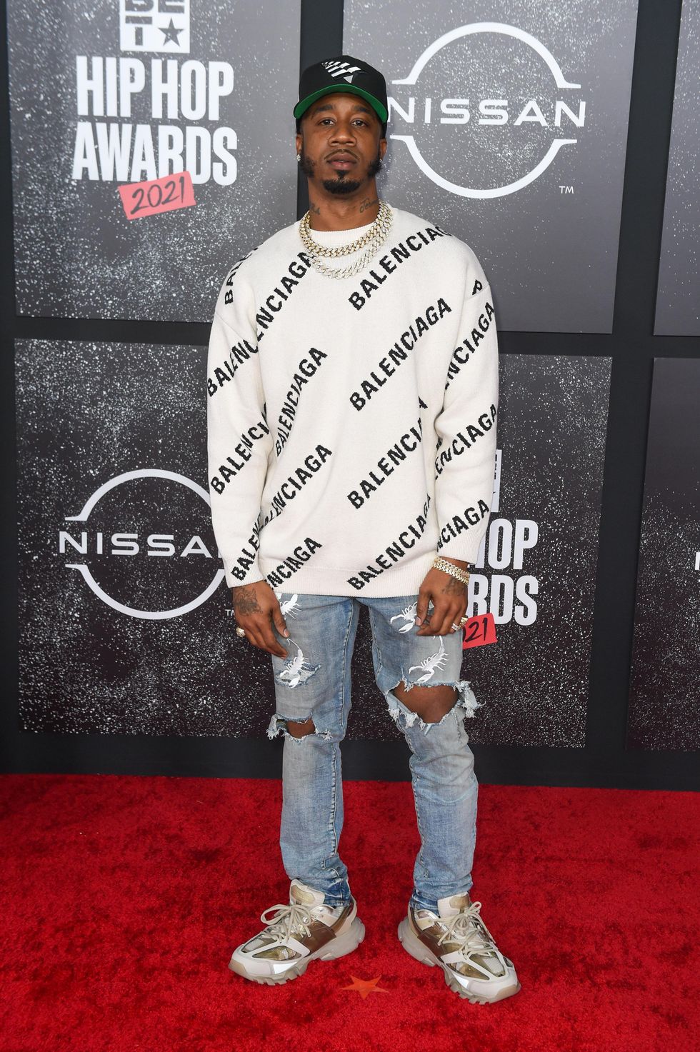 Benny the Butcher stayed casual in a logo-centric Balenciaga sweater and gold accessories.