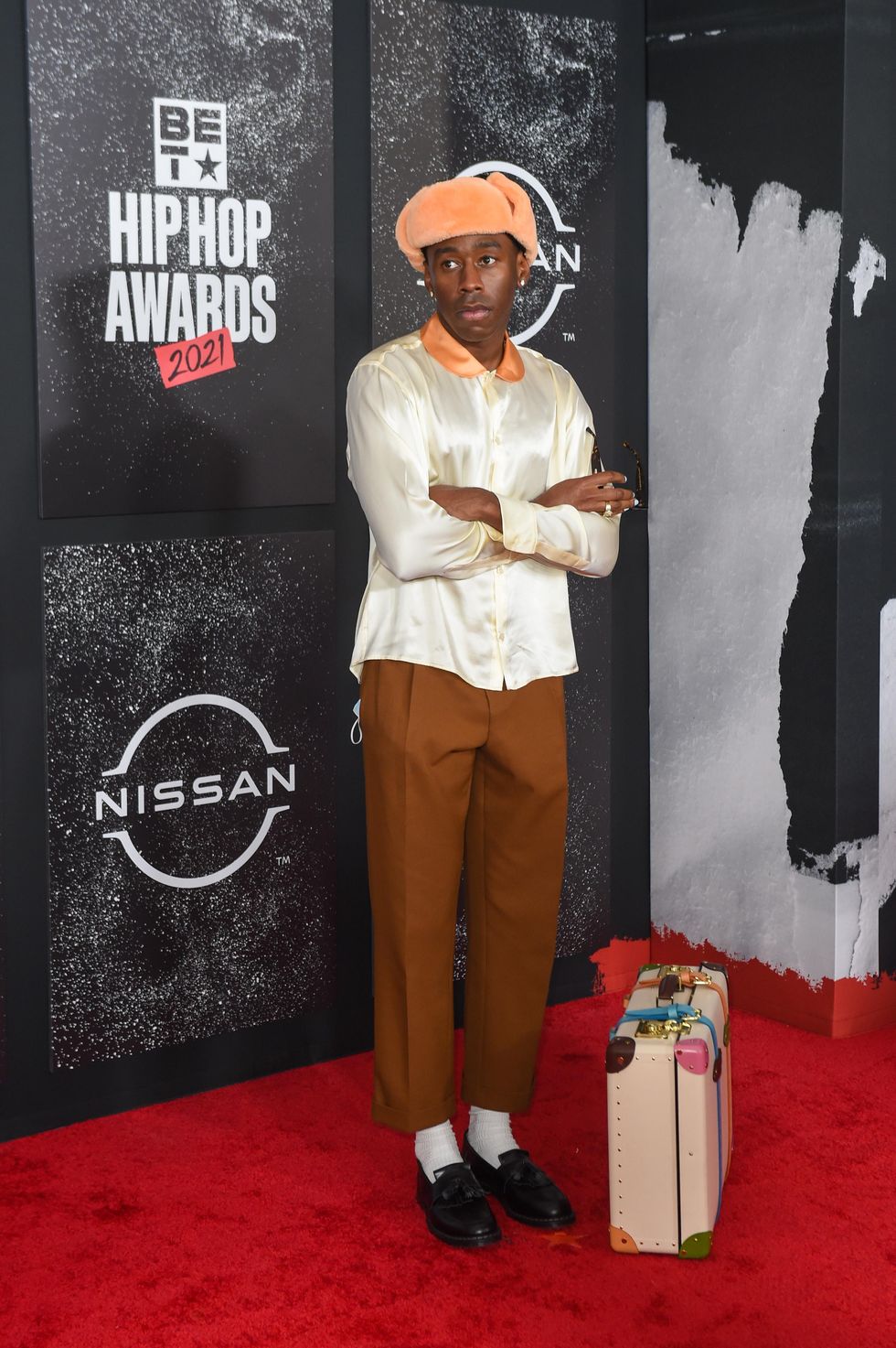 Tyler, the Creator secured the bag literally. He channeled classic bellhop vibes in a plush orange hat, silky smooth button-up, and match suitcase that he often posed with on the carpet.