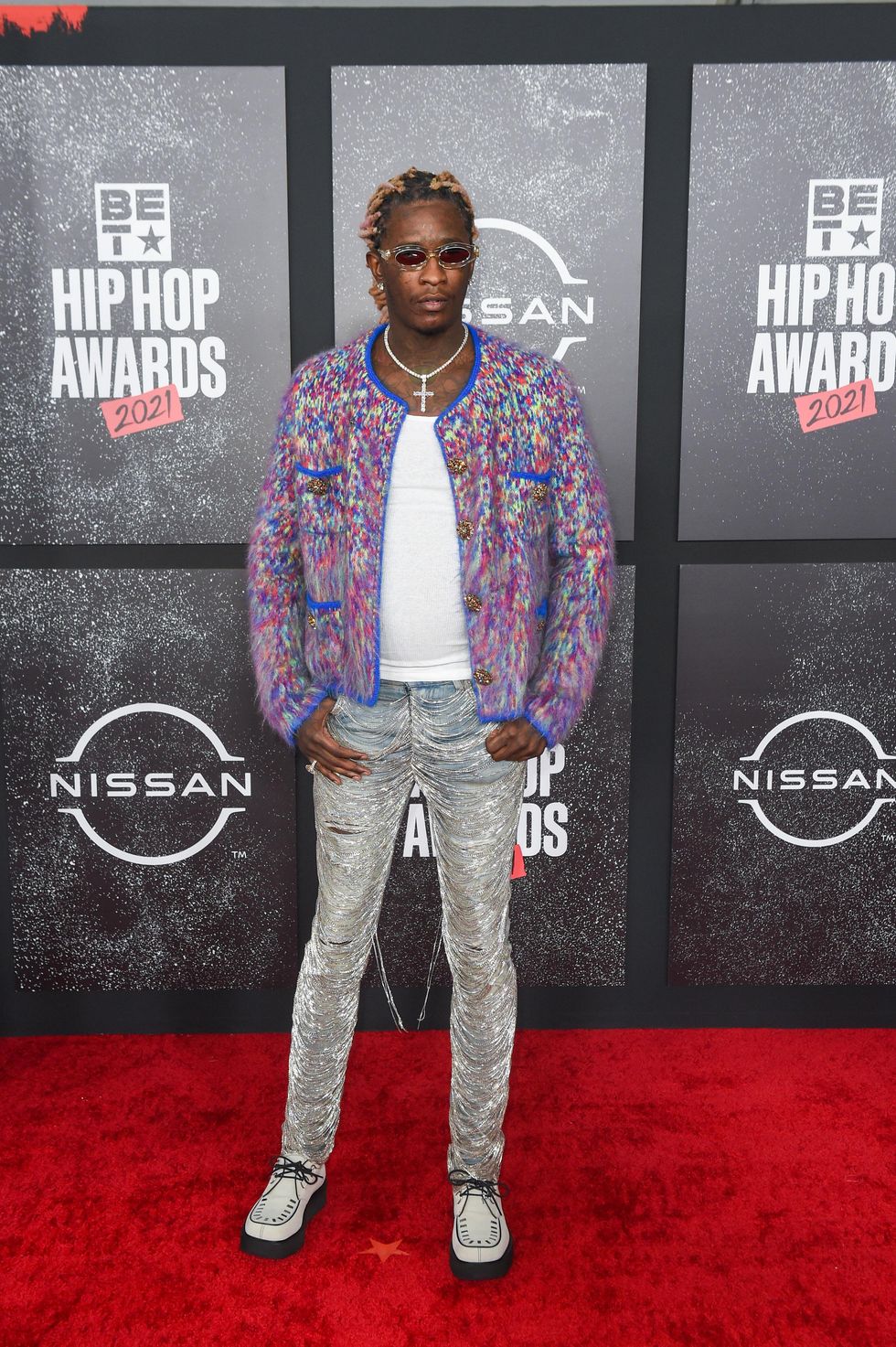 By far one of the biggest risk-takers on the red carpet, Young Thug sported metallic-draped jeans and a fur-lined cardigan jacket. Complete with 90s style sunglasses, we always appreciate a man who takes risks in fashion.