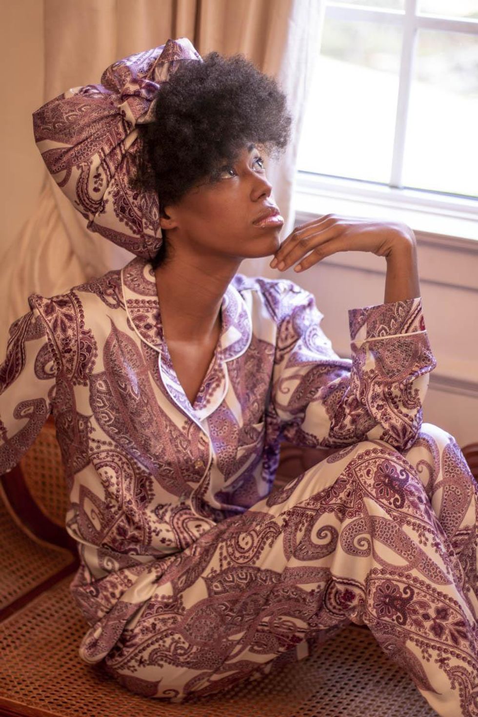 This modern three-piece set with luxury French seams and double-turned hems screams, "Black girl luxury." The LJ Signature pattern and exquisite quality exude comfort and elegance.