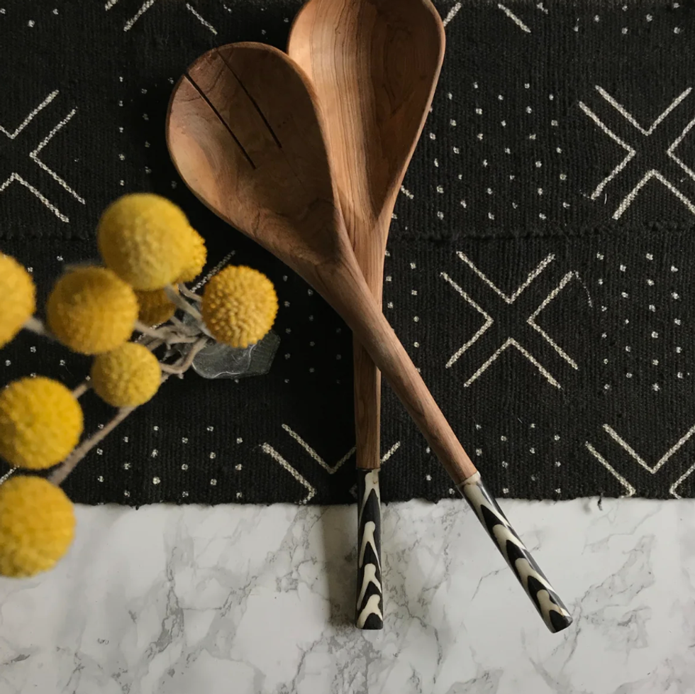 Handmade of olive wood and dyed bone, these salad servers will add a global flair to your dinner for two or party of five. Sustainably harvested bone inlay accents are dyed from organic plant extracts, making each set a true one of a kind. Enjoy these throughout the years, and watch the wooden tones deepen with age.