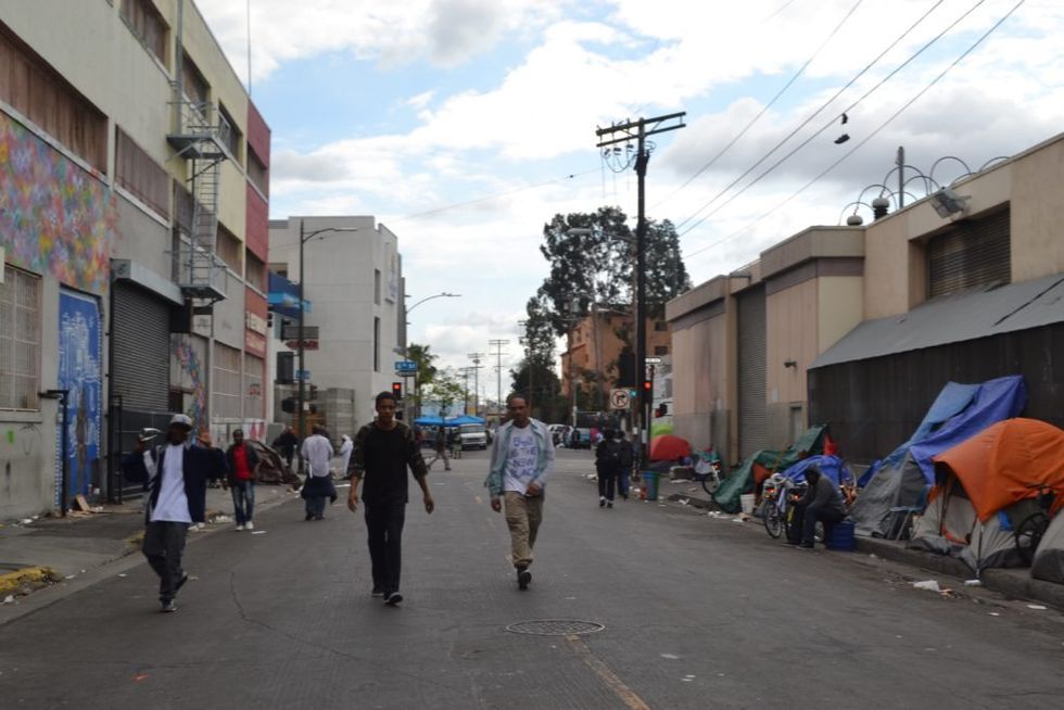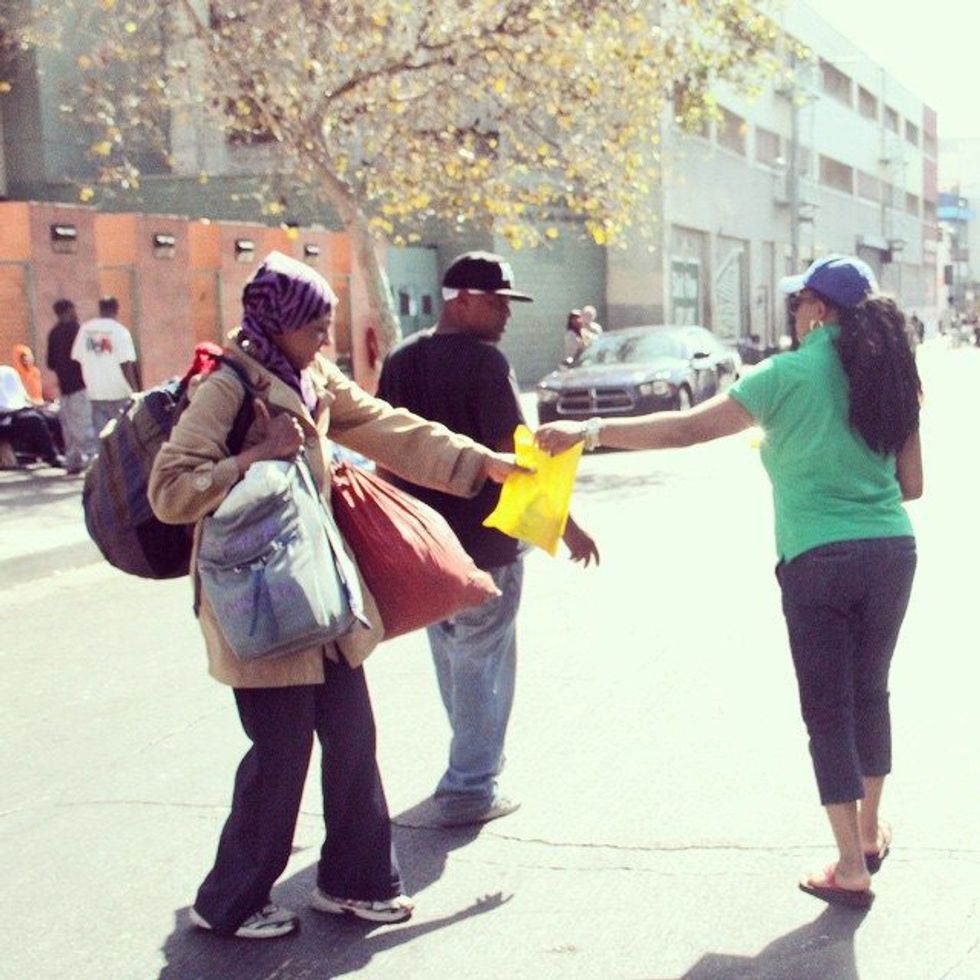 We load up our cars with lunches and period kits and head over to 5th and Crocker street, the coordinates for the famed Skid Row. It's crowded, and before I can even pull the bags out of the back of my car, I'm surrounded by a small group of mostly men reaching their hands out for lunches. I cautiously inform them that I'm carrying the bags for the women, some walk away in disappointment, a few, though, ask if they can take a bag for their wives, girlfriends, or women who don't have the strength to move out of their self-designated areas. “They still love each other, even though they're homeless, there's still love around," Chelsea tells me.
