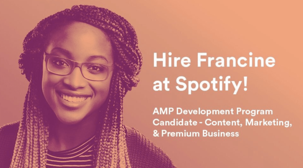 Francine Tamakloe did just that in her recent pursuit of a job with Spotify. Rather than go the traditional route, Francine went above and beyond to prove that not only was she qualified for the position, but that she had the drive and passion that would set her apart from the pack of applicants.