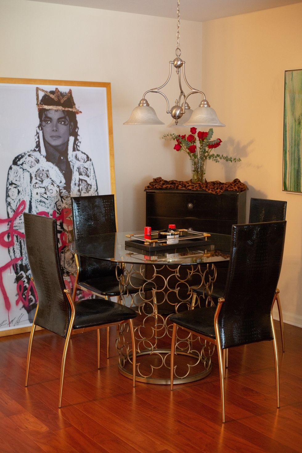 "I bought this Michael Jackson piece at American Signature Furniture. I thought it was really cool and I really wanted a big piece of art. Big art is expensive and I'm a newbie at figuring out what my taste in art is, so I thought this was cool. The graffiti on top of Michael and the crown - I really liked it. It was a great deal and I just had to have it. It was perfect for the wall. I want to say I got this table from Overstock.com. And I think I got the chair from the same website."