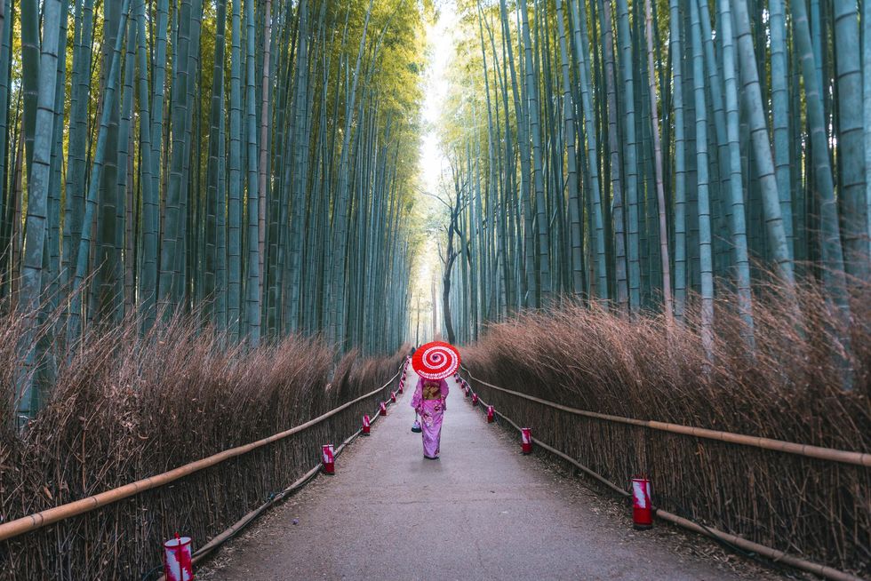 Japanese woman walking in bamboo grove, Arashiyama, Kyoto, Japan.