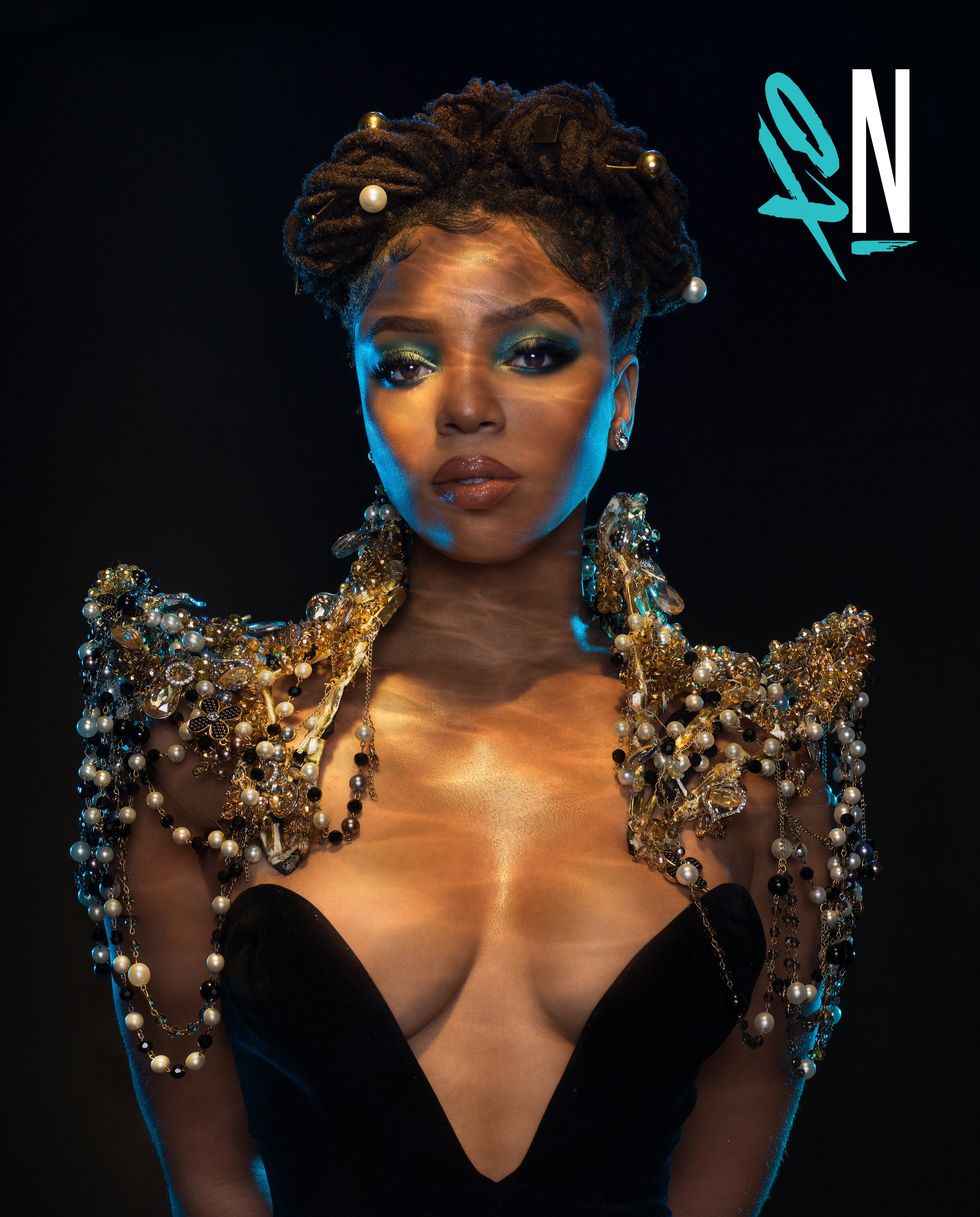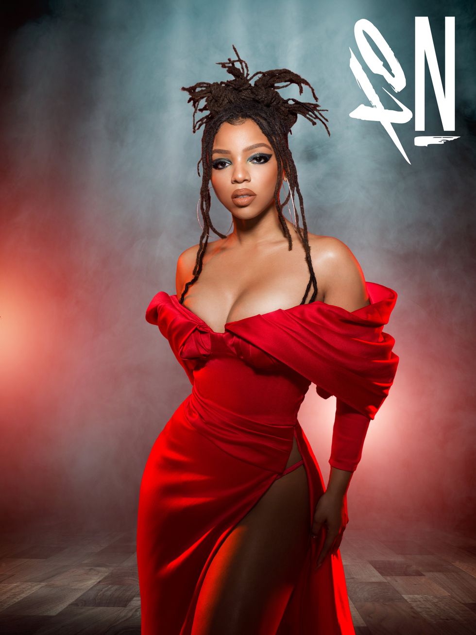 On set inside of a mid-city Los Angeles studio, it’s all eyes on Chlöe. She slightly shifts her body against a dark backdrop amidst camera clicks and whirs, giving a seductive pout here, and piercing eye contact there. Her chocolate locs are adorned with a few jewels that she requested to spice up the look, and on her shoulders rests a jeweled piece that she asked to be turned around to better showcase her neck (“I feel a bit old,” she said of the original direction). Her shapely figure is tucked into a strapless bodysuit with a deep v-neck that complements her décolletage.