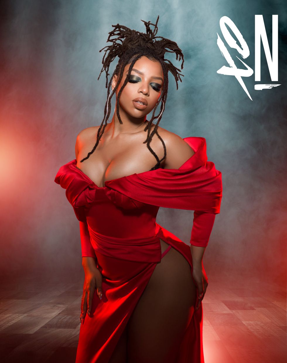 On set, Chlöe exudes the energy of Aphrodite in an apple red, off-shoulder dress with a sexy high split. In between shots, she mouths the lyrics to Yebba’s “Boomerang” as it echoes throughout the space in steady repetition at my recommendation. The hour grows late, yet Chlöe is heating things up as eyes stare in deep mesmerization of the girl on fire.