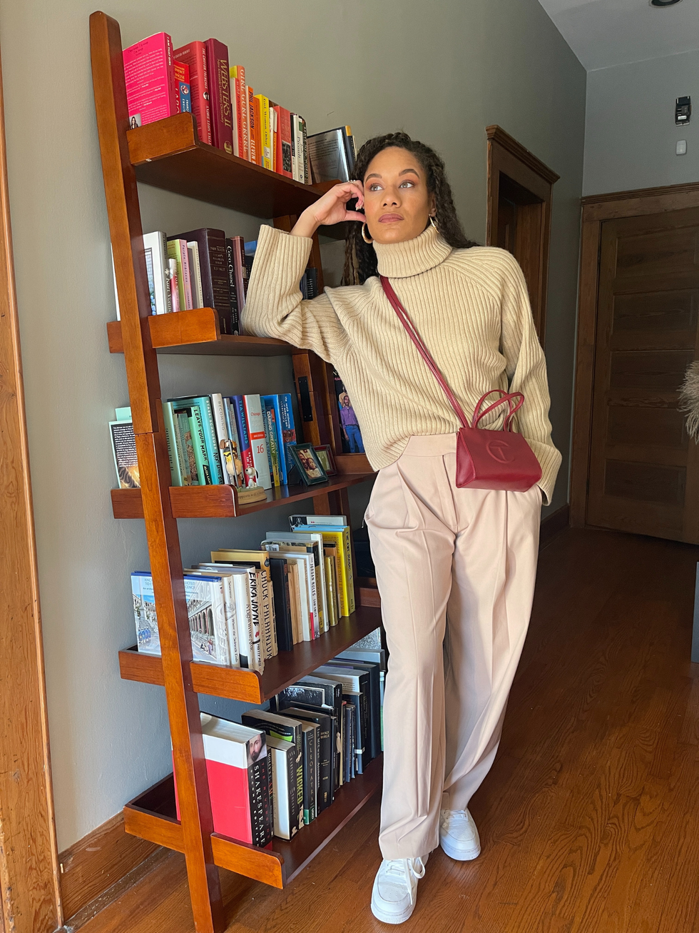 "Since my weeks start meeting-heavy, I gravitate towards looks that make me feel self-assured and put together. Nothing says that like tonal dressing, so I paired my favorite chunky knit with my favorite trousers for an elevated WFH ‘fit."
