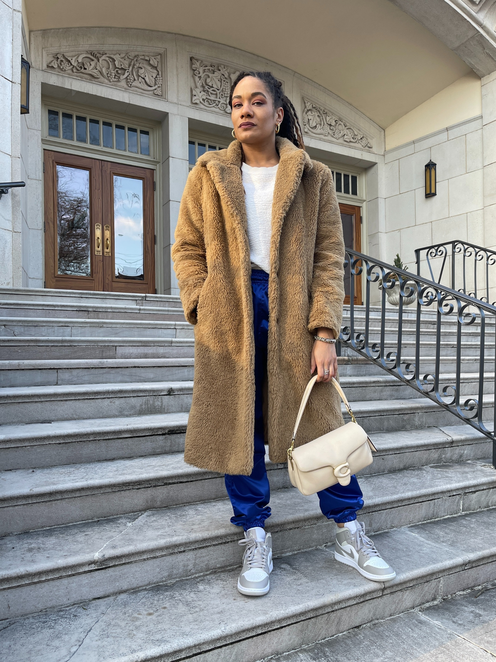 "Causal vibes for humpday, especially when it’s below freezing outside. Since I opted for my satin blue joggers to elevate the look, I dressed it down with a white sweater and camel teddy coat. To keep an element of style to the look, I added my retro 1’s and Pillow Tabby Coach bag."