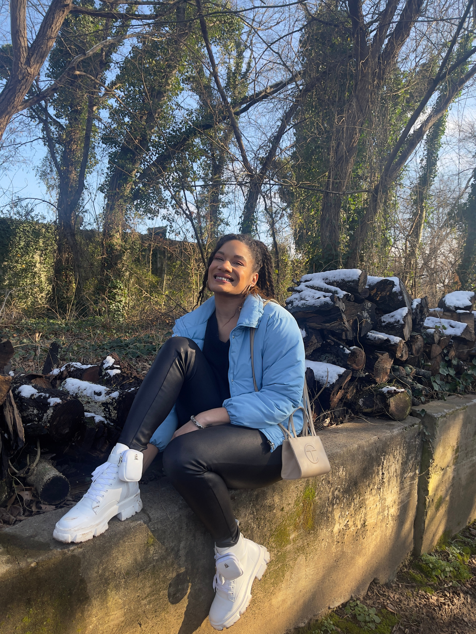 "For snow-filled days, the assignment is easy: Stay warm. So when I did venture outside, I reached for this baby blue puffer without hesitation. It’s pretty lightweight so I wore a thicker long-sleeve bodysuit underneath, paired it with faux leather leggings, and topped it off with the pièce de résistance: Oversized white combat boots."