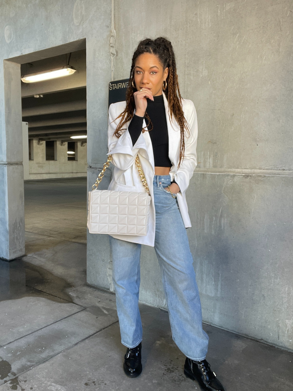 "If I had a ‘winter uniform,’ this would be it. There’s something so simple and marvelous about a perfect pair of denim and a structured blazer. I opted for a cutout high-neck top and Doc Martin-style boots to add a bit of cool."