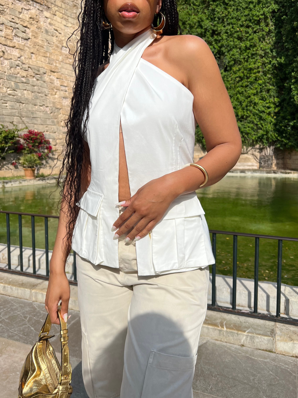 The cargo look has dominated fashion trends for a couple of years, and now its influence has spread to incorporate more than just oversized pants. This cargo halter neck open-front top was an exciting addition to my vacation-ready looks, I couldn’t wait to wear it. Keeping it light and neutral, I paired it with tan cargo pants along with light green sunglasses for a subtle pop of color.