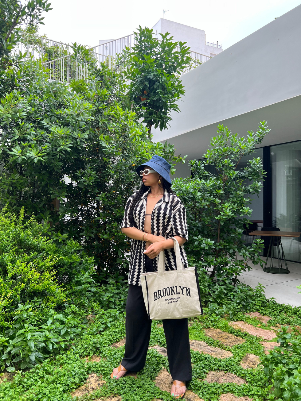 There’s only one requirement when traveling to a warm European destination: lightweight fabrics. A fun play on textures and patterns, I paired a men’s cream and black knit top worn as a cover-up early in the day, ultimately transitioning my look with a pair of trousers for an evening walk around the city. Linen pants are my favorite this time of year because of their versatility and feel.