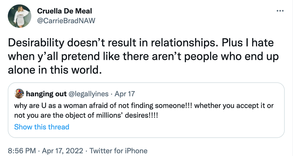 I was scrolling Twitter, of course, when I came across and replied to a tweet that said, "Why are you as a woman afraid of not finding someone? Whether you accept it or not, you are the object of millions’ desires." My gears immediately ground upon reading this tweet and I felt the need to respond because it’s an opinion that the author is positioning as an overly optimistic, accidentally condescending socialized factual retort.