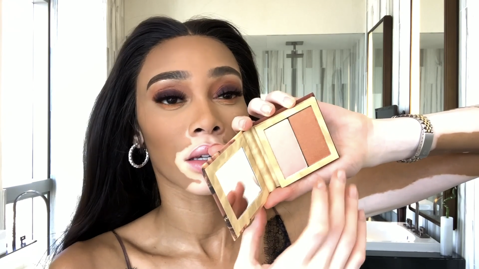 "I wanted to be chocolate girl-friendly. So I made this beautiful golden bronzy highlight and this like iridescent, almost pink. And then I'm going to go in with that top shade and I'm going to highlight my nose."