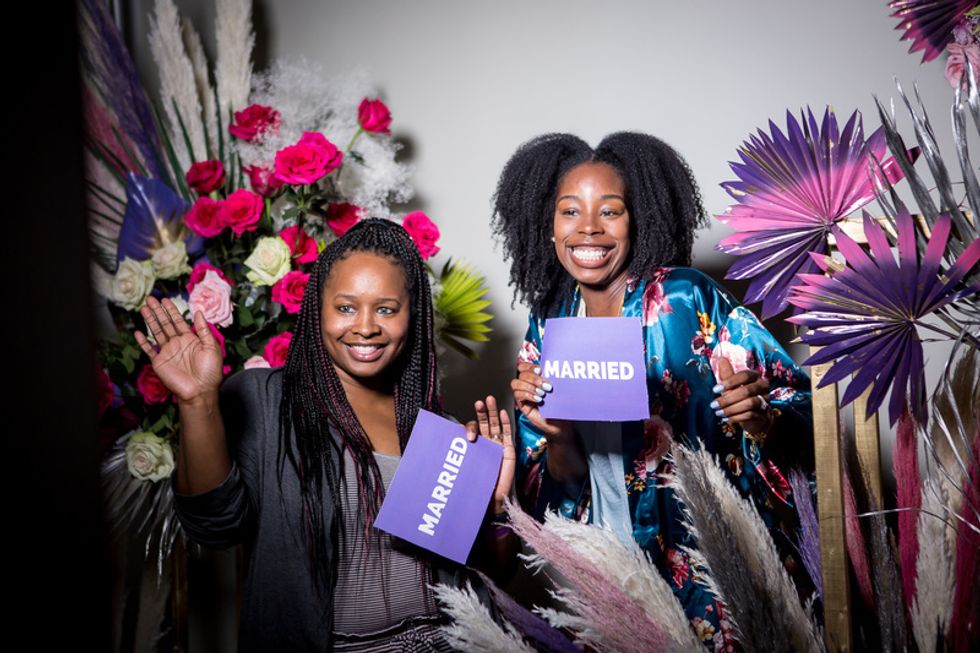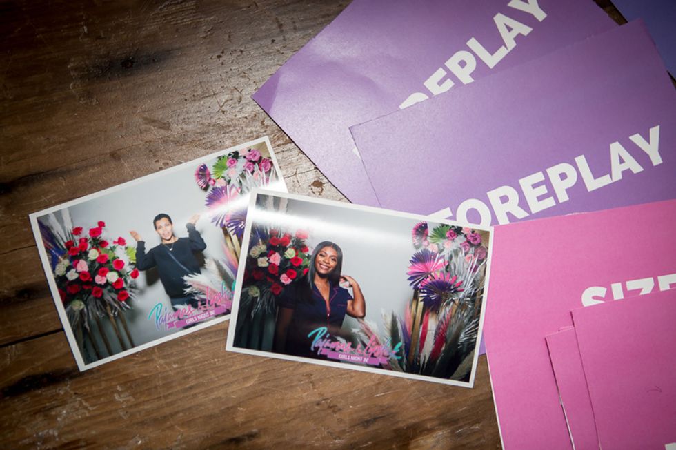 Toward the end of the evening, guests were in for a surprise when their names were pulled at random to answer spicy questions on sex and dating via the Pajamas & Lipstick envelope game. At check-in, each guest was given a wristband to indicate their relationship status: single (pink), in a relationship (blue), married (purple), it's complicated (yellow), and their status corresponded with the envelope they were able to choose from.