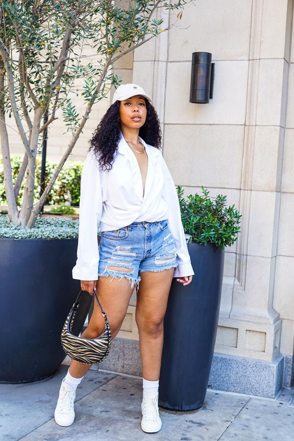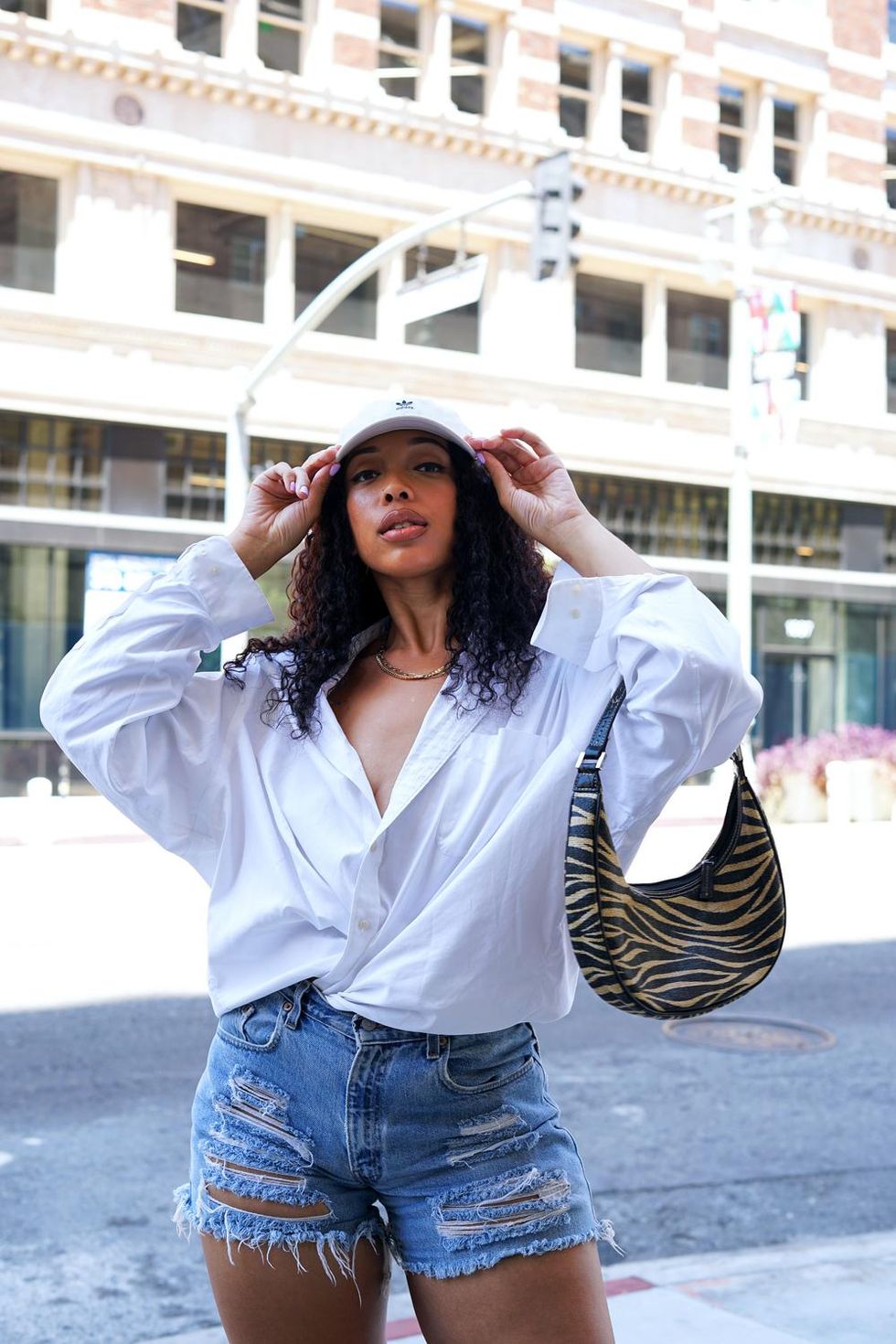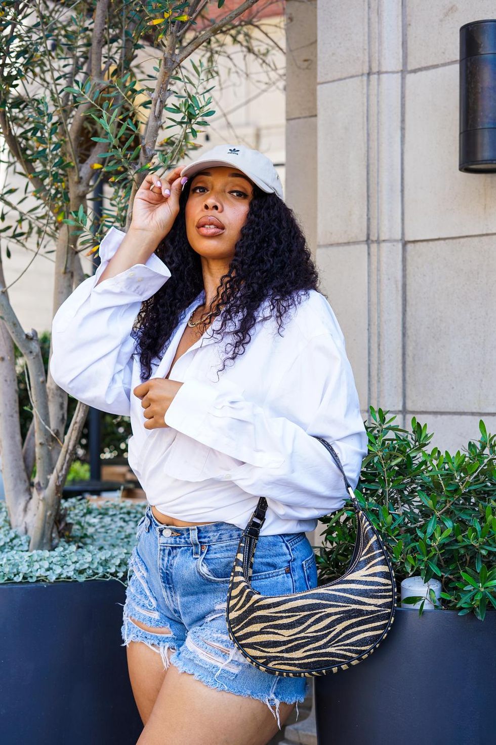 Denim shorts are a classic go-to for an effortless look. Paired with an oversized button-down, I decided to wrap the hem of my top to add some flair to this oversized basic. Opt to wear it open with a cami or buttoned for a variety of looks. For a sporty touch, I added an Adidas cap for an effortlessly stylish curated ensemble along with my favorite zebra print straw bag.