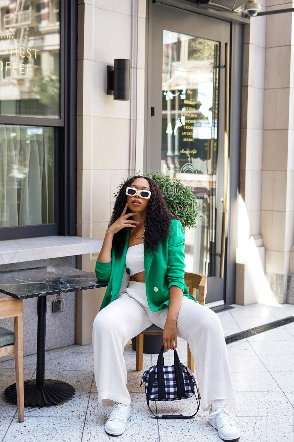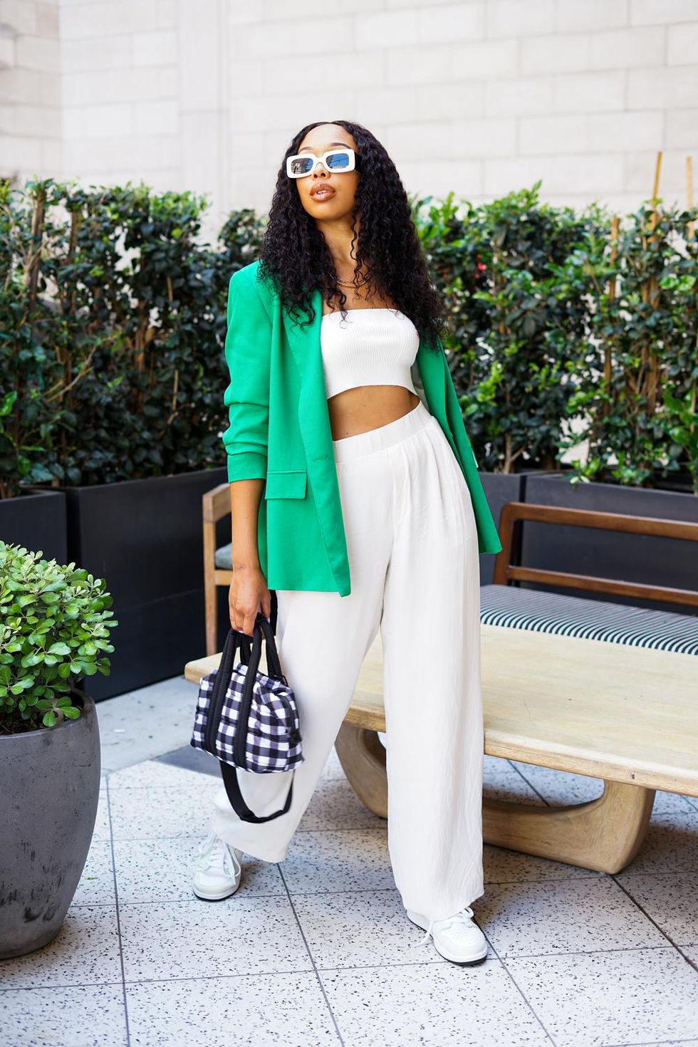 When in the mood for those comfortable go-to sweatpants, grab a wide-leg soft pant as a lightweight alternative. Worn with a matching knit crop top, I paired this look with a bold green blazer and low-top sneaker for the ultimate comfy chic ensemble. Green has been one of my favorite colors, and with the rise in its popularity this summer, I'm having fun implementing it with my everyday looks.