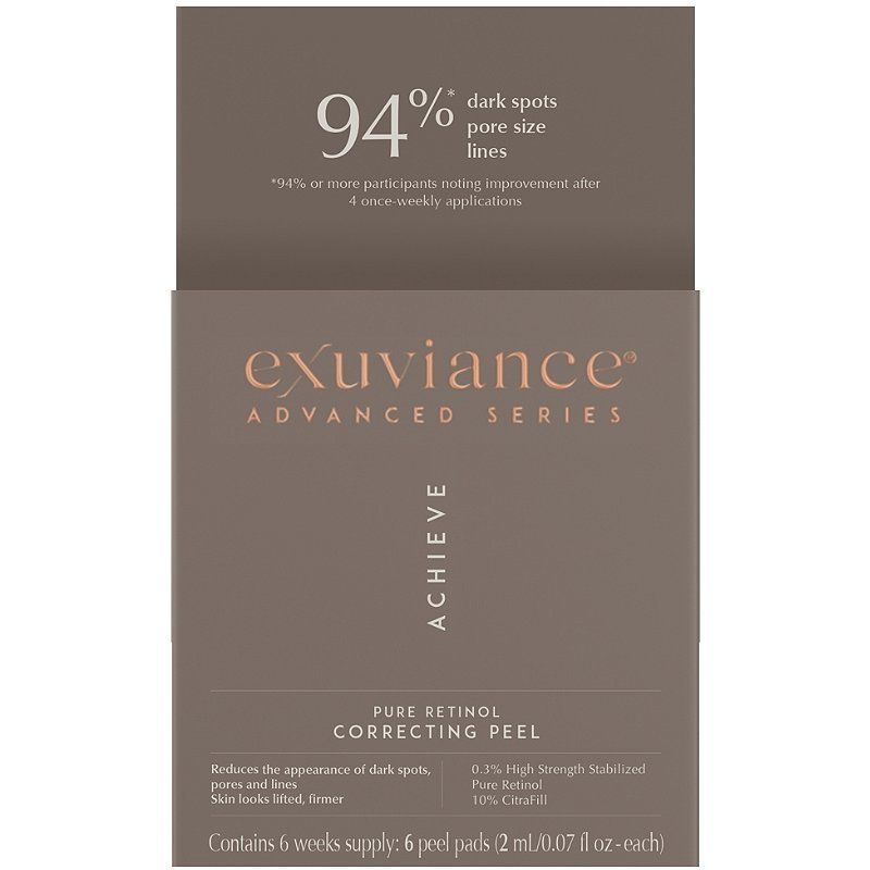 One word: brightening. This correcting peel by Exuviance is an intensive retinol correcting peel that improves the look and feel of your skin's texture over time. With consistent weekly use, the peel makes dark spots caused by aging, scarring, or sun damage less visible on the surface of the skin. Your skin will be lifted, firmer, and more flawless in no time.